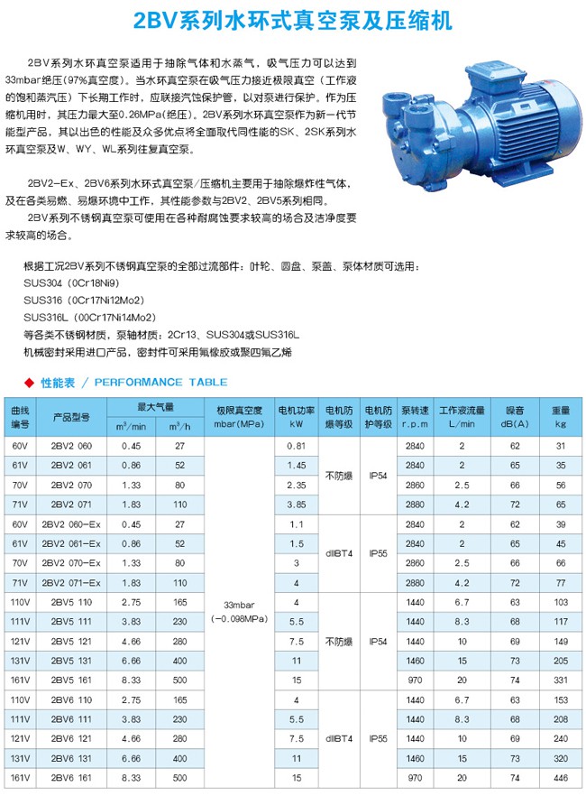2BV水環真空泵適用于抽除氣體和水蒸氣,吸氣壓力可以達到33mbar絕壓(97%真空度)。當真空泵在吸氣壓力低于80mbar的狀態下長期工作時,應聯接氣蝕保護管,以對泵進行保護。如配大氣噴射器,吸氣壓力可達10mbar,噴射器可直接安裝在真空泵上。作為壓縮機用時,其壓力至0.26MPa(絕壓) 。